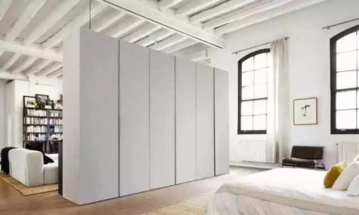 卧室的屏风隔断除了一样要求美观以外,还要具有一定的收纳的功能。对于小户型,或是单身公寓楼的装修,利用卧室隔断可以将大房间分割成一间客厅加一间卧室,或是分出两个卧室,使得小空间中功能性变强。