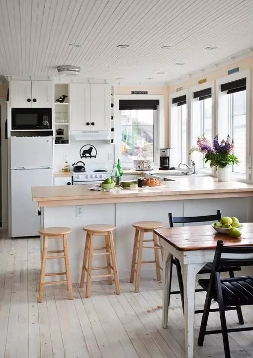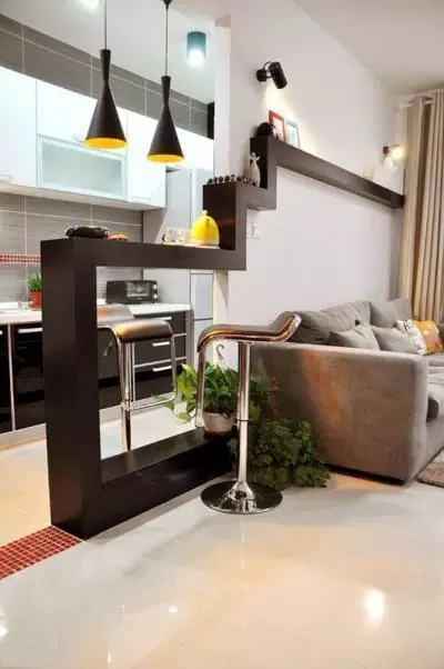 吧台是开放式厨房的宠儿,但也同样是设计师们爱用的隔断设计,由于吧台设计注意人与人之间的交流,用做隔断还会平添几分情趣。