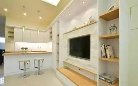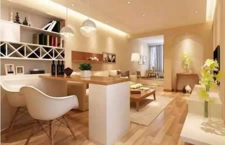 比较适合客厅和餐厅非常狭长的户型,过道在中间吧客餐厅分开的户型最好还是在餐厅做吧台,或者把餐边柜结合在一起。
