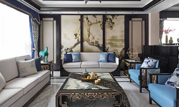 在新中式风格为基调的居室中通过采用色彩搭配上的技巧,使房间既秉承了中式古风,同时又不失现代城市气息。