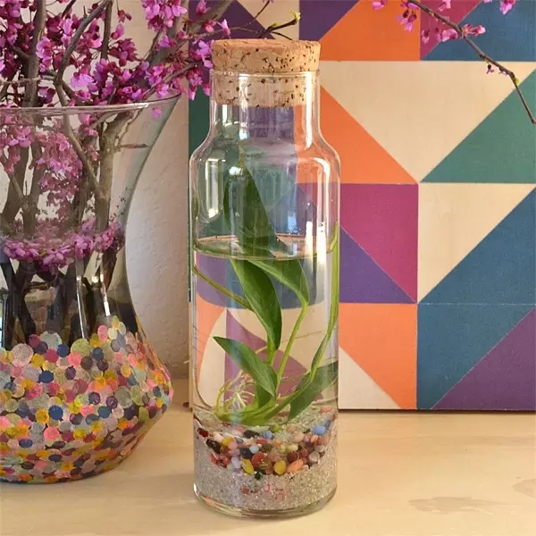如果你喜欢的植物因为忘了浇水而枯萎掉的话,你一定会很伤心吧,小编告诉你一个小窍门,防止类似的情况发生,那就是把水培绿植放在一个装了水的瓶子中,在瓶底放一些沙子和漂亮的小碎石,这样一来既漂亮又实用,摆在家里就是一道亮丽的风景线。
