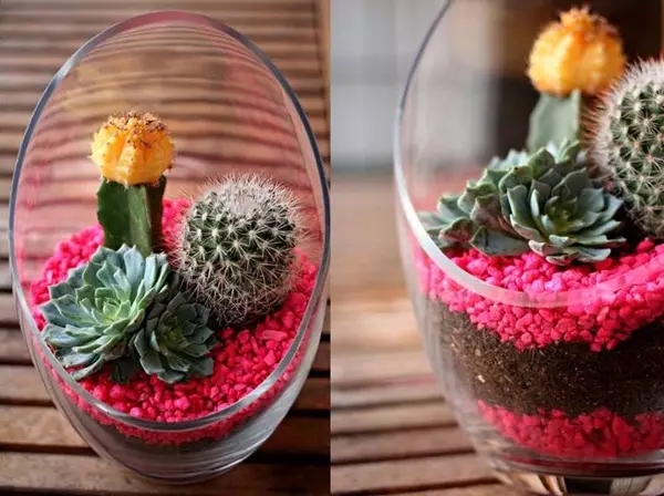 你是否想过给你的盆栽增添一点亮丽的颜色呢?你可以选择不同颜色的沙子、小石子铺在透明的小盆中,这样一来就会有很不一样的效果!譬如将鲜艳的粉红色的石子铺在最上层,是不是感觉像一块诱人的草莓蛋糕呢?