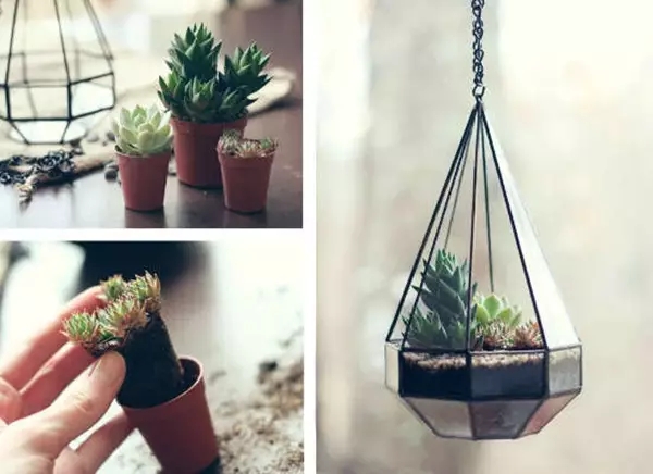 如何才能使自己的盆栽不落入俗套呢?我想设计师一定是受到了吊灯的启发,将萌萌的多肉与冷艳的铁架吊灯相结合,产生出一种不同美感碰撞后的冲突美感。