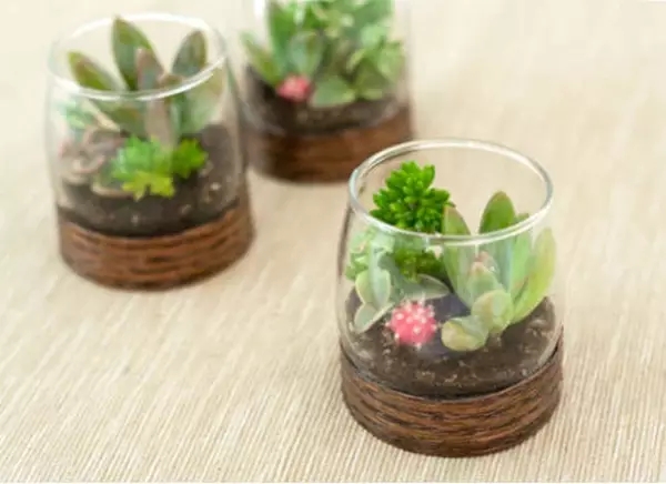 谁说杯子只能用来喝水了?家里面不用的透明小杯子放着也是放着,设计师为它找了一个好去处,和萌萌哒的多肉搭在一起,同样都是有着肉肉的质感,在下面放一个小木垫,别提有多可爱了!