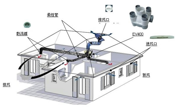 新风系统是由新风换气机及管道附件组成的一套独立空气处理系统,新风换气机将室外新鲜气体经过过滤、净化,通过管道输送到室内。原理是根据在密闭的室内一侧用专用设备向室内送新风,再从另一侧由专用设备向室外排出,在室内会形成“新风流动场”,从而满足室内新风换气的需要。