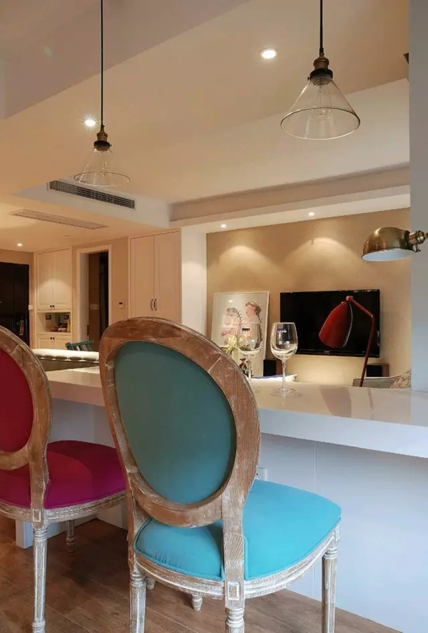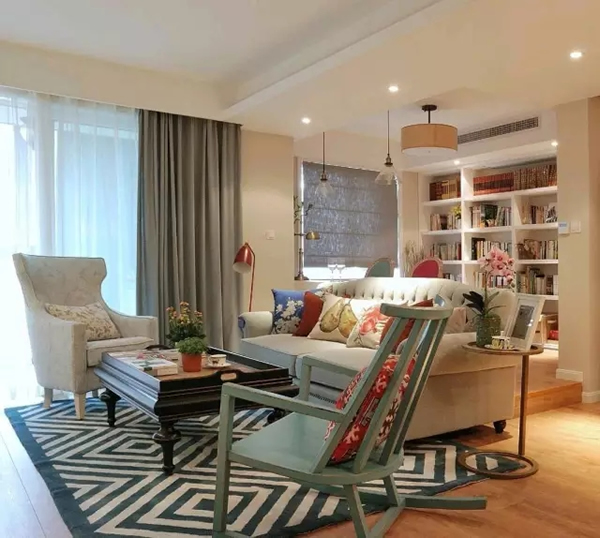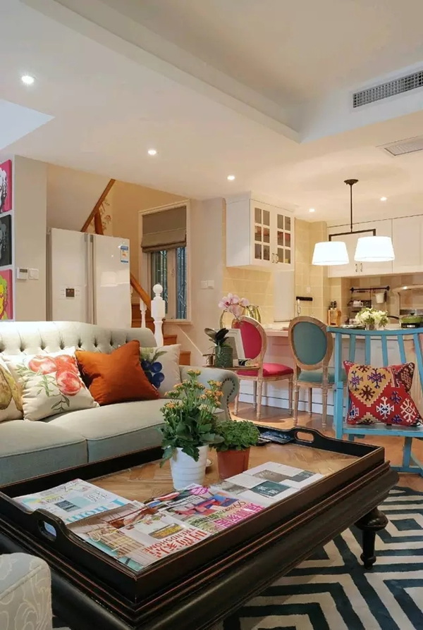 ▲在硬装上主要以白色和木色为主,所以为了满足房主对靓丽色彩的喜爱,在家具的选择上更加倾向绚丽色彩的搭配。深色实木的茶几点缀蓝色单人椅,让空间色彩丰富不杂乱。