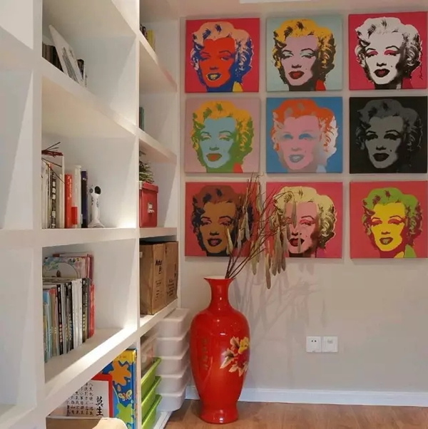 ▲休闲区的设备怎么能离的了大书架呢,读书是夫妻两最常用的消遣方式。七彩的梦露装饰画让规矩的空间活跃了不少。
