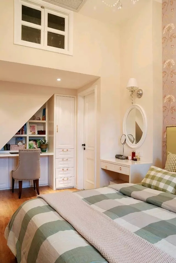 ▲主卧室很好地利用了楼梯下的空间,完美将小小的工作区域与储物区设置在楼梯的这一方架空区域,空间达到最大利用率。
