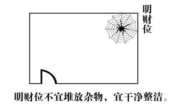 5、明财位宜净:此"净"非彼"静",这里所说的"净",是指明财位宜整洁干净,因为"明财位"又叫"聚气位"有藏风聚气的作用,因此如果"明财位"卫生不净或杂物过多的话,便会影响全家财运和健康运势。