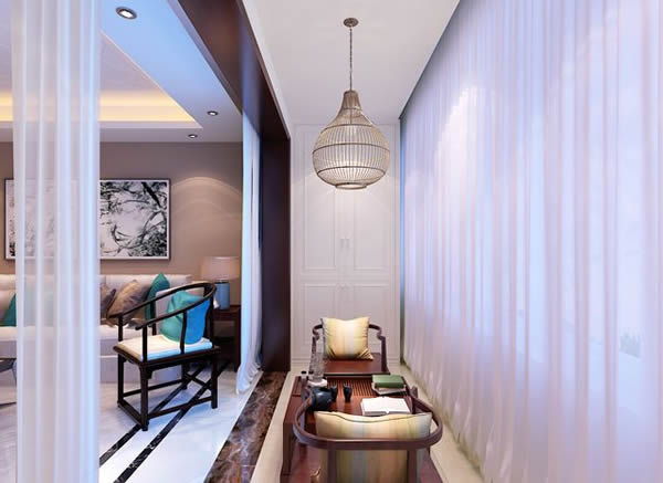 若你家的阳台装修选择唯美风,如窗帘全是选择略透的白色纱缦布料,那么在阳台灯具的选择时尽量的选择以复古为主调并且带有金属色彩的吊灯进行装饰最佳,因为整个阳台的装饰都是选择浅色,若灯具再无色彩突出,那么整个家装就会显的了无生气,而且阳台的天花板尽量的选择原木色的桑拿板进行装饰,这样效果更佳。