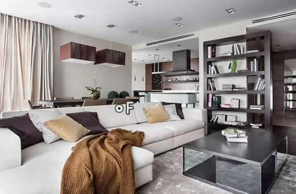 A:前后通透的的置物展示架是隔断空间最常用的家具,展示柜分成多个储物格,既可以置放装饰摆件,又可以摆放书籍当成书架使用,还不会影响室内的通风与采光。