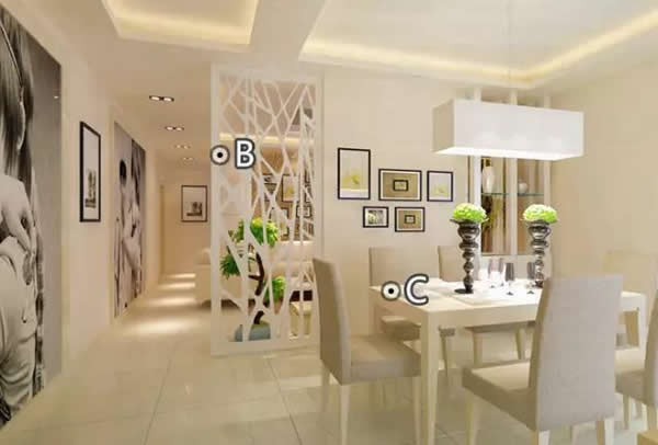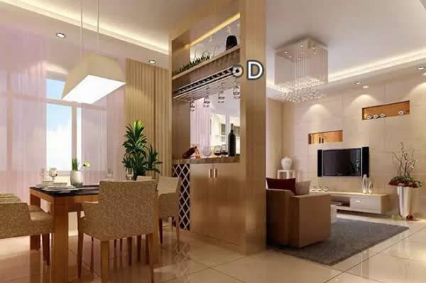 D:酒柜吧台隔断也是分隔客厅与餐厅空间的灵活手段之一,其最大的好处在于让两个空间隔而不断,彼此保持呼应,令整个空间通透、开敞,充满现代时尚感。