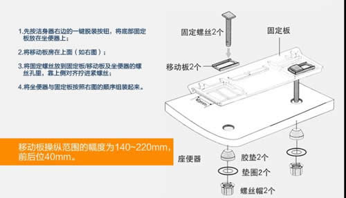 智能马桶盖安装步骤四:安装多功能固定板(调节马桶盖的位置)。