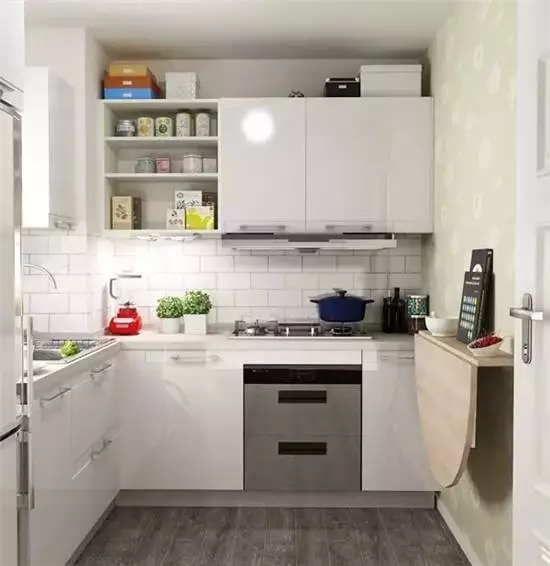 L型布局+挂壁折叠餐桌,让小空间也实现厨餐一体,地柜+抽屉,实现丰富收纳