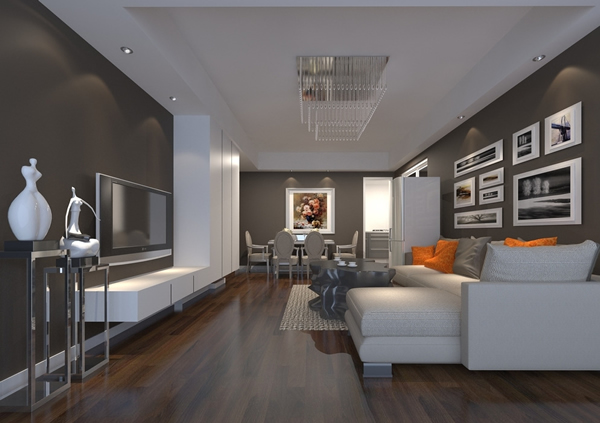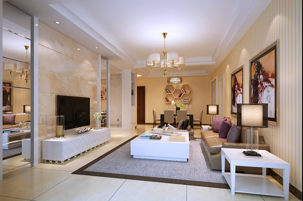 墙面的装饰在布置客厅中起着关键作用,如果客厅墙面为一片空白,难免为显得单调,为避免影响客厅整体温馨感,则建议在墙面上适当放置一些字画、摄影作品、墙壁装饰品等,同时注意装饰品的尺寸大小要适中,不可过度装饰。对于客厅的地面装饰除了常见的地毯之外,还可在瓷砖或者地板上下功夫,如果条件允许,尽量选择质量好的、若地板或瓷砖有图案,建议选用艺术性强的图案,否则不但没有美感,还会增加居室的杂乱感。