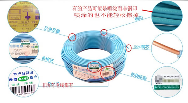 正规厂家的外观包装有清晰的合格证,商标规范。 包装上印有长度、规格、生产厂商、生产地址、检验章、生产日期、防伪标识等;拆开包装后电线电缆上印有商标、规格、电压而且字迹用抹布等工具无法轻松去除。