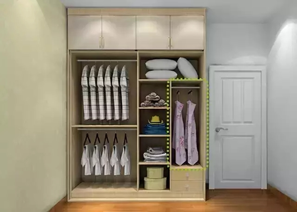 长衣区主要用于悬挂风衣、羽绒服、大衣、连衣裙、礼服等长款衣服。可根据自己拥有长款衣服的件数设计长衣区的宽度,一般来讲,宽450mm即够一个人使用,如果人口较多,可适当加宽。