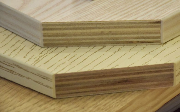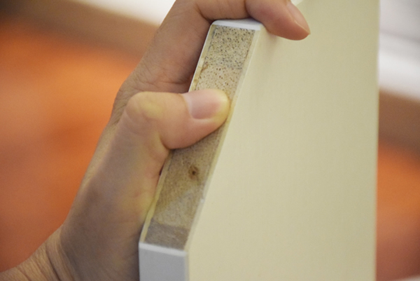 一、观察横截面每一层板的粘合是否细腻、结实,可以用拇指指甲用力压下,能轻易按下去,或者扣得到木屑掉下来的,都不是好货。
