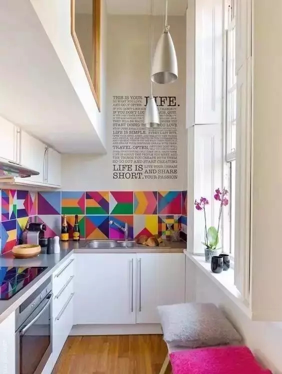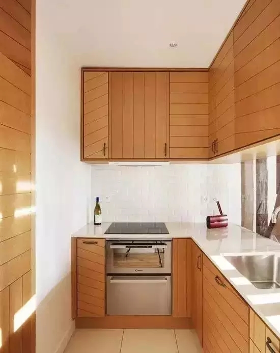 水槽、操作台、灶台在同一个平面上,三点一线是常见的一字型厨房,因为占地面积小,很适合小户型或单身公寓。