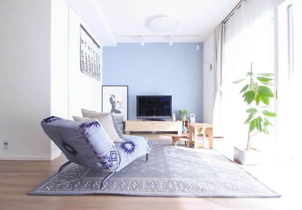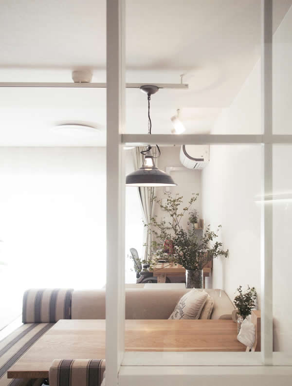 客厅的面积不大,用简单的桌椅来替代沙发,同时设计一整个玻璃窗让光线穿透进来也拉长了视野,使用地毯、木质家具让整个客厅看起来简单而不平凡。