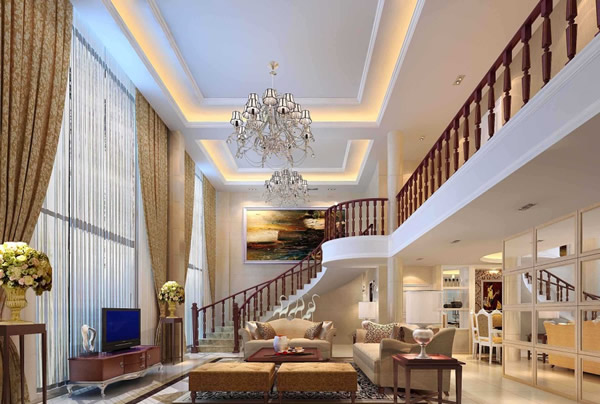 四、客厅变成门厅,这是在“豪华”别墅中常见的景象:进门处或大厅中央,或是一道直梯凌空而起,或是一道弧梯如虹飞架,或是一道旋梯溯风而上……那“隆重推出”的架势,反把整个底层分隔得支离破碎,使蛰居一隅的客厅成了“门厅”的陪衬,如同专为陌生客“留步稍候”而设的“大堂会客区”。
