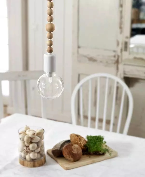 ▲低垂至桌面的灯,显得更随意,还有一个好处,可以弥补灯头和餐桌位置没有正对的尴尬,稍微偏一点的效果更好。木头珠子带有强烈的手作痕迹,DIY的兴头上来了,还能给它们涂上不同的颜色。