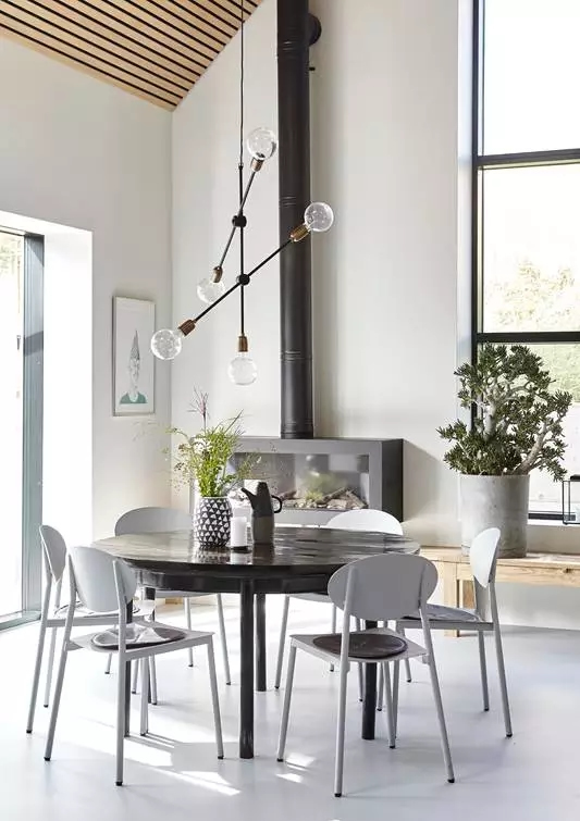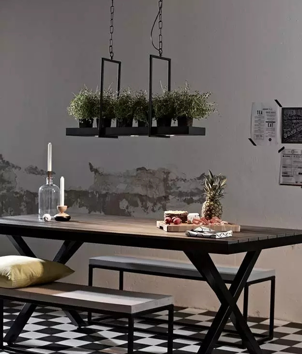 ▲植物托盘和灯集中在一起,餐桌上方永远都能有绿植相伴。硬朗的线条,见棱见角的细节,搭配的餐桌款式也不能太柔弱。