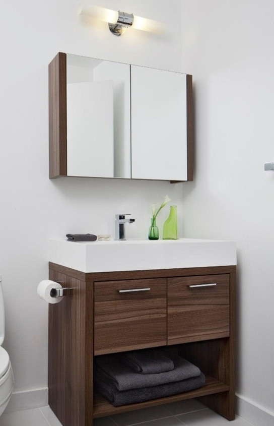 所以她选择的是上面可以放置洗浴用品的镜柜,是非常有用的。比如类似这种款式,打开镜子里面可以放不少东西。