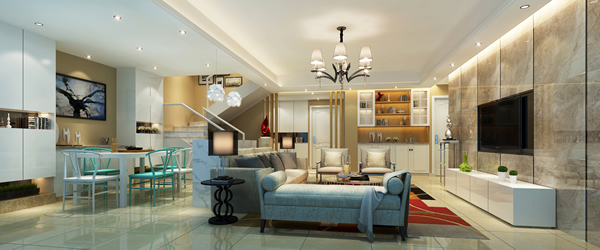 由于复式房有了足够的层高落差,在做欧式复式楼装修的吊顶时,对灯具款式的选择面更大,可以选择一些高档的豪华灯具,以体现主人的生活品位。在客厅灯具的选择上,用更高档的灯具来装饰点缀,以备家庭聚会或有重大活动之用。而在其他地方可以使用吊灯、筒灯、射灯、壁灯等,灵活搭配使用,会显得很有韵味和变化、灵动活泼。在楼梯附近,要有照明灯光的引导,也是室内效果的点缀。这样通过设计不同的灯光,主次明暗的层次变幻,营造出了一种舒适随意的家的氛围。