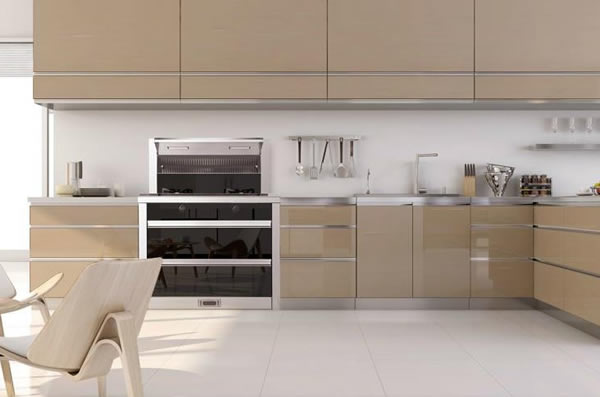 从目前家具橱柜市场上可以看到,不锈钢橱柜台面一般只有不锈钢厨房使用,几乎难以看见其他柜体材质的橱柜搭配不锈钢台面的现象。不锈钢外表看上去比较亮,很好清洗,这种橱柜会给人一种干净的感觉。不锈钢橱柜台面给人的感觉也是比较舒适的。