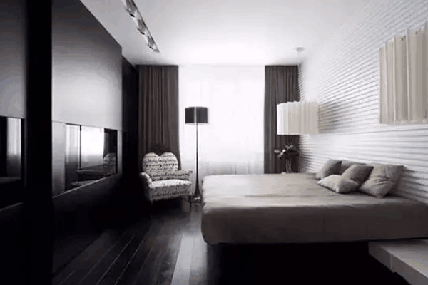现代风格:黑白灰配色的床和床上用品显得空间沉稳安静,是卧室应有的气氛。但是浅色单品也不能少,灯具、绿植以及别具一格的沙发,起到画龙点睛的作用。
