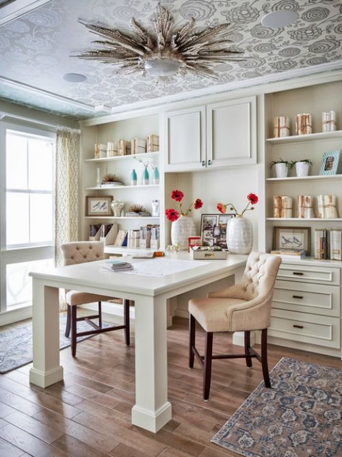 对家庭办公室来说,符合个人习惯的布局是非常重要的。这间双人工作室,T字型工作台将两个人的工作区隔开,避免打扰,而工作台中间的部分又是非常好的沟通空间。良好的动线设计带来的是便利的工作体验。