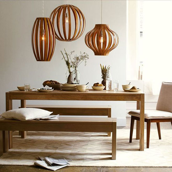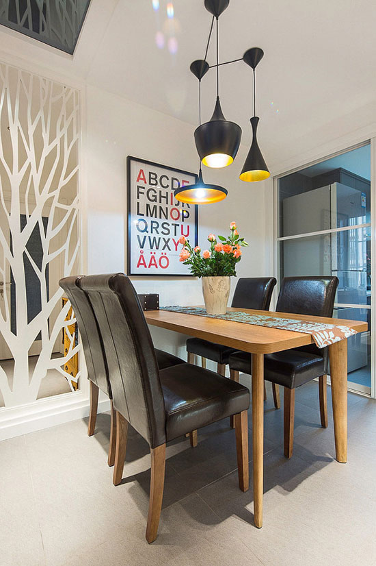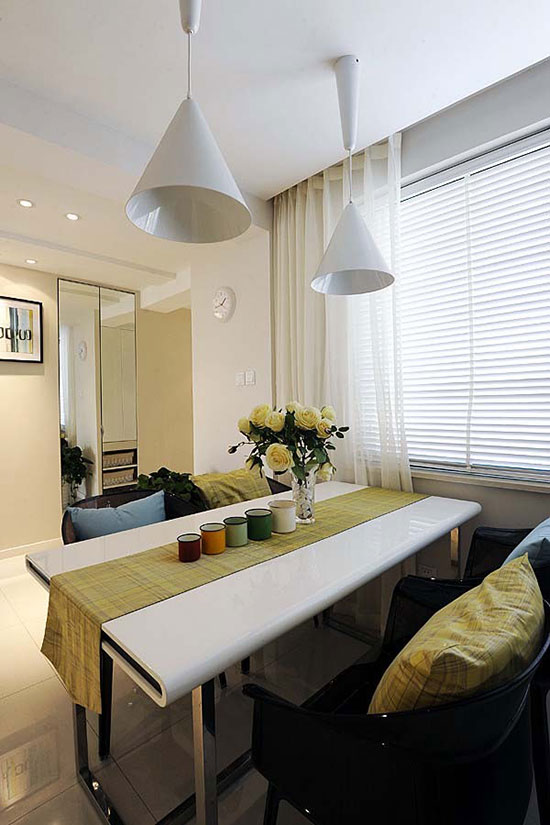 如果餐桌为长条型,那么只有一盏单头吊灯是远远不够的。两盏吊灯同时提供光源,照明范围更广,照明效果更好。吊灯的颜色和款式,最好与餐厅的设计风格相统一,这样才能够起到最为美观的视觉效果。