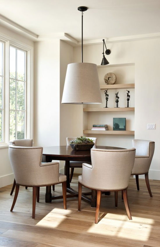 单头吊灯让照明更加集中,但灯光能够照到的范围较小。如果餐桌比较小,或者餐桌为圆形,那么使用单头吊灯即可满足需要。无灯罩包裹的光源,灯光更加分散,适用于整个餐厅空间的照明;有灯罩包裹的光源,灯光更加集中,对食物的突出强调效果也更强。
