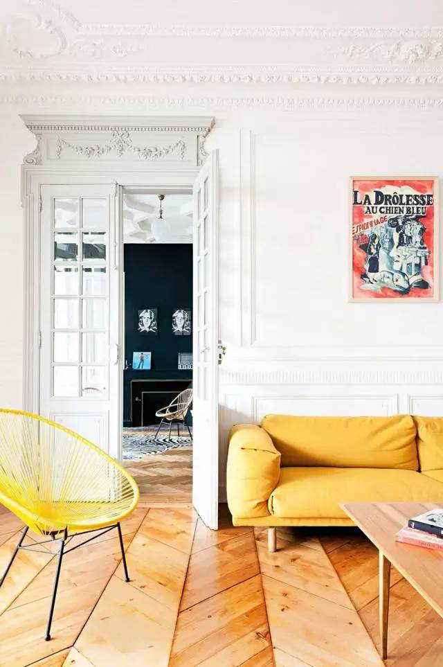 装饰造型、镶木地板、铅板窗口和大胆的波普颜色及干净整洁的线条。
