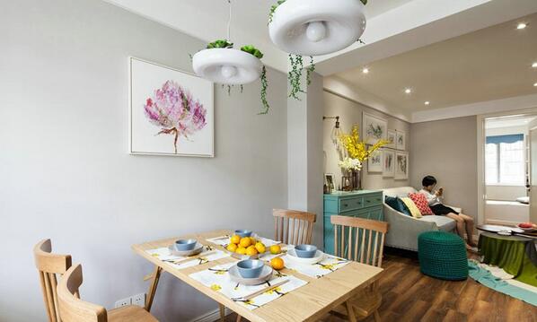 天然原木地板使用时增加脚感的舒适,搭配原木色桌子与凳子,加上植被的点缀,营造绿色的夏日清新之感。配上朝南的阳光,仿佛坐在室内也如同在室外一样。 简单的绿色颜色搭配和挂画为客厅增添了生色。