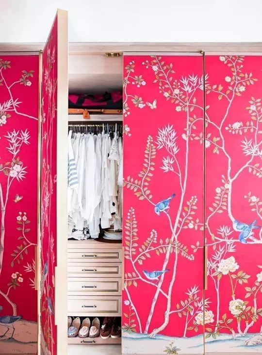 ▲磨砂玻璃柜门用腻了,直接在上面贴壁纸,装饰效果极强。