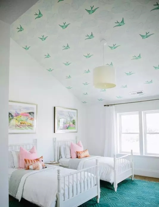 ▲天花板面积有限,一样起到空间装饰的作用,比起贴四面墙或者是单面墙,这种方法好像更经济哦。
