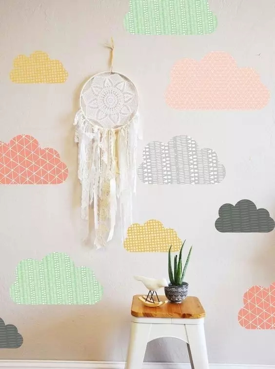 ▲零碎的壁纸剪成大小不一的云朵形状,贴在小孩子房间。
