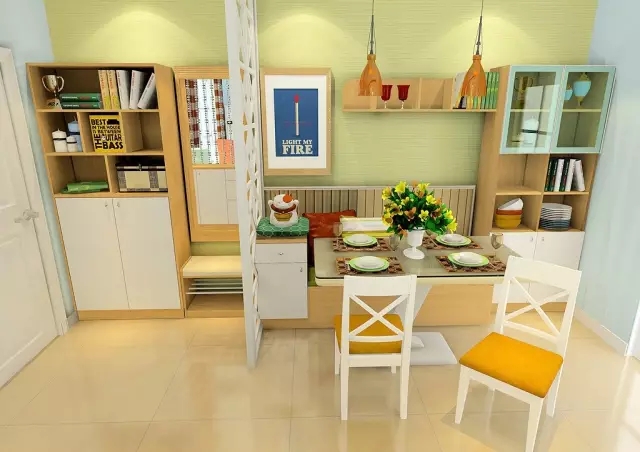 解决方案:餐厅用卡座设计,既能满足餐厅的座椅需求,满足餐厅的收纳功能,还可以填补凹凸位带来的空间浪费。