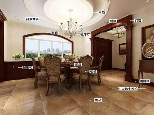 踢脚线:餐厅踢脚线一般跟着门颜色走,一般由安装木门的师傅安装。 地砖:规格多种。质坚、耐压耐磨,能防潮。有的经上釉处理,具有装饰作用。 中央除尘系统:主机置于室外,通过连接吸尘管道将灰尘、纸屑等吸到主机垃圾袋中,避免了灰尘带来的二次污染及噪音的污染,确保是清洁的室内环境。 背景音乐系统:每个房间都可以听到曼妙的音乐,创造一个温馨舒适的家庭生活环境,家人可以随意选择自己喜欢的歌曲而且互不打扰。 窗套:用于保护和装饰门框及窗框。门窗套包括筒子板和贴脸,与墙连接在一起。 餐桌椅家具:家用餐桌是餐厅中最重要的家具,是一家人聚首进食的重要之处,维系着一家人感情、健康和运气的作用。 餐边柜:餐桌一边主要有收纳功能储物柜,可以供放置碗碟筷、酒类、饮料类,以及临时放汤和菜肴用,也可放置客人包小物件!