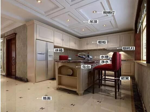 橱柜:橱柜可以说是厨房的大佬级人物,不仅要有高颜值,更要实用、耐用,更换代价比较大,建议选品质好有保障的商家,对于台面石英石目前是主流。 水处理系统:解决居家用水四大影响健康问题:颗粒杂质、水垢、异色异味和细菌病毒,减少因水源问题造成的健康伤害。 地面和墙面:一般为瓷砖,但也有少数业主地面会选择用地板,用地板一般适宜不怎么烧饭的家庭,另外墙面砖不建议选择暗色系,(地面砖可以,耐脏、易清洁),考虑到厨房的采光效果,避免空间压抑。 集成吊顶:厨房一般会选择用集成吊顶,集成吊顶在防火性能上、抗老化、适用寿命、美观程度等等都要比塑钢板、PVC要好很多。 灯:厨房照明灯或者吧台灯即可。 水槽:用于排水法收集气体、或用来盛大量水并可用于洗净餐具、食物的仪器。 岛台:岛型厨房是开放式厨房的典型式之一,营造出一个开放式、温馨的就餐环境。