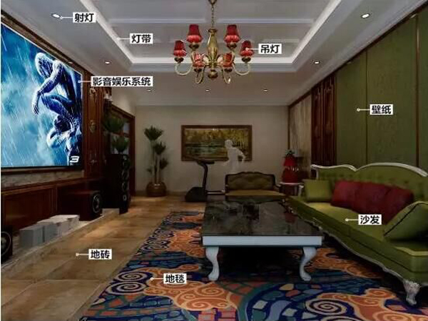 中央空调:现在选择中央空调的业主越来越多,除了因为外机位的原因,中央空调的隐蔽性,节约空间,更加的高大上等等原因成了大家选择的理由,像风管机的价钱更是与柜机相差不大,中央空调还是个不错选择的。 新风系统:近几年因为空气质量越来越差而备受关注,新风系统从一开始的有没有必要装质疑到现在被认可,证明了它可以给全家一个好的呼吸环境的优点。 地面:地板或者瓷砖,地板客厅通铺在美式装修中很普遍,简约风的话一般选择瓷砖为主。 护墙板:美式风格中普遍出现,分为全包和半包。 石膏线:用于吊顶,但现在有的装修也会选择不要石膏线,吊顶越来越简约,追求个性化。 踢脚线:客厅踢脚线一般跟着门颜色走,一般由安装木门的师傅安装。 吊灯:客厅吊灯教授个人认为主要起装饰作用,以美观为主。客厅吊灯可以选择大气、或者个性款。 射灯:射灯一般用于沙发背景或者电视背景墙,能很好的起到烘托气氛的作用。(电视墙安射灯,适当增加亮度可以保护眼睛) 墙面材料:装修公司告诉你可以选择油漆、墙纸、墙布、海吉布、硅藻泥等等,油漆易开裂,选择需注意。 灯管、灯带:可以起到很好的照明效果,营造氛围。定制酒柜:嵌入式酒柜设计,不仅节省了空间,不留卫生死角方便清洁打理。 智能窗帘:通过主控制器遥控开启或关闭的窗帘,可与智能照明系统组合场景模式,实现轻松联动。