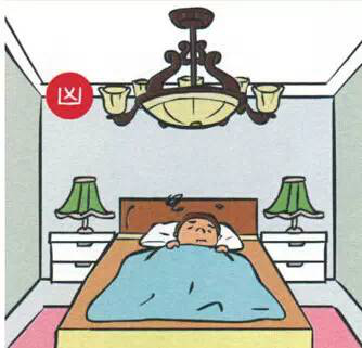 卧房的天花板,应简单为宜。千万别学商业空间,弄得非常艺术、花样百出,甚至装上镜子,这会使人不易入睡,久而久之健康会出问题。床位上方不可挂奇形怪状的灯具,会使人产生紧张不安的感觉。位于地震带的居室,床的正上方最好是完全没有任何灯具,卧室照明尽量使用床头桌灯或立灯及靠近墙边的隐藏灯管。