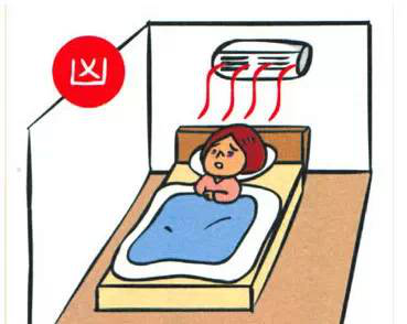 床位安置在空调下方,寒气不断吹向头、肩、颈,人在睡眠状态时,毛细孔会略微放开。如此放置,轻者经常感冒,重者会造成头、肩、颈的神经紧张、肌肉僵化。