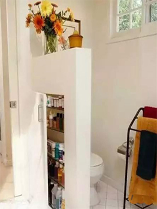 卫生间充分利用墙面,收纳柜和置物架的使用,即是一种美化装饰,使墙面不太单调,同时又是收纳展示的区域。