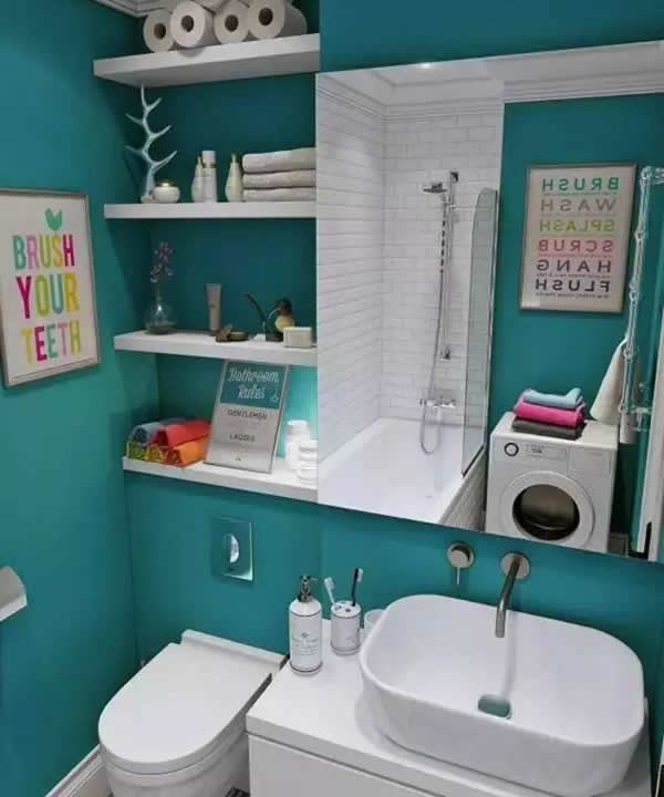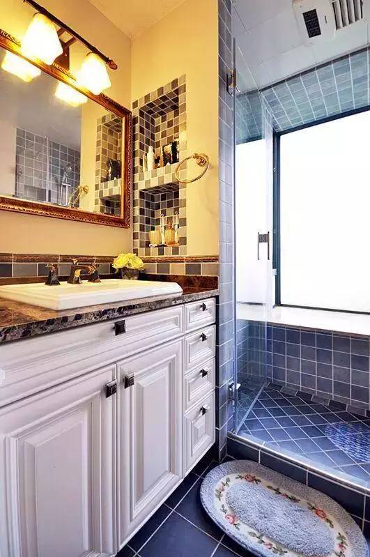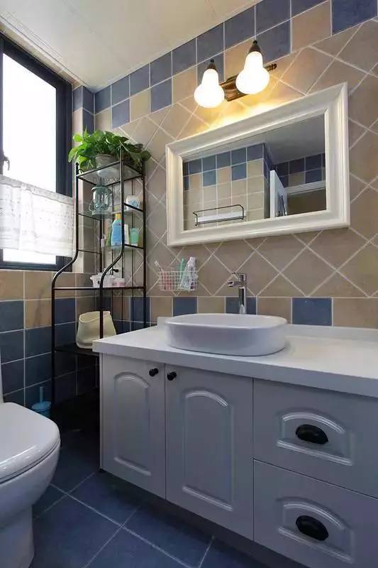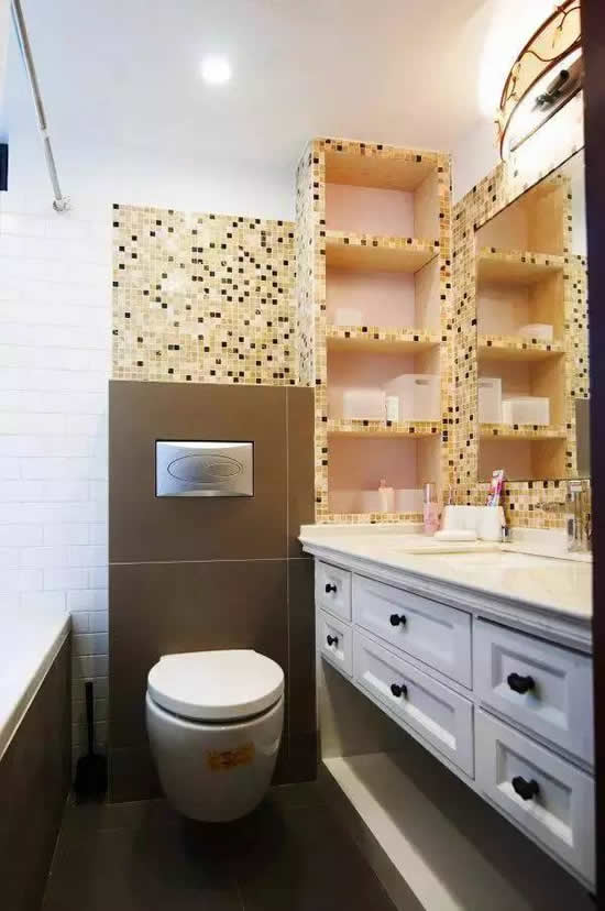 4.在台盆和墙面的位置,利用狭小的空间用水泥和马赛克设计一个置物柜,防水又实用,和整体风格搭配的也非常和谐,是非常棒的收纳设计。