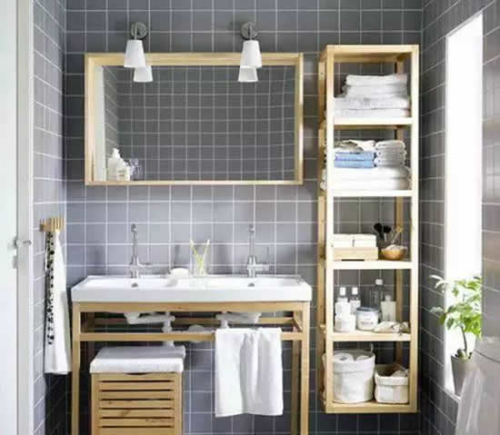 1.灰色素雅的卫生间,利用台盆侧面和墙面之间的狭小空间量身定做一个木架挂在墙上,分层的设计有助于将不同的洗浴用品分门别类的摆放好,非常实用美观。