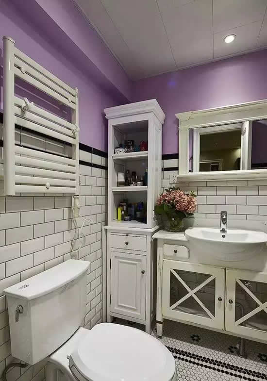 3.在白色的台盆旁边的角落定制了一个大小合适的置物柜,上面是分层置物架,下面是一个封闭式的置物柜,非常具有实用性和美观性,和整个卫生间搭配的相得益彰。