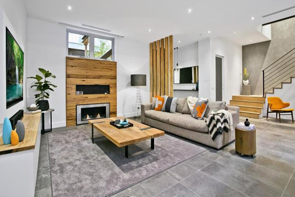 这款客厅的木质元素主要使用在了家具上面的铺垫,茶几、摆座、隔板、壁炉的明亮木色让这个空间都变得鲜活起来。